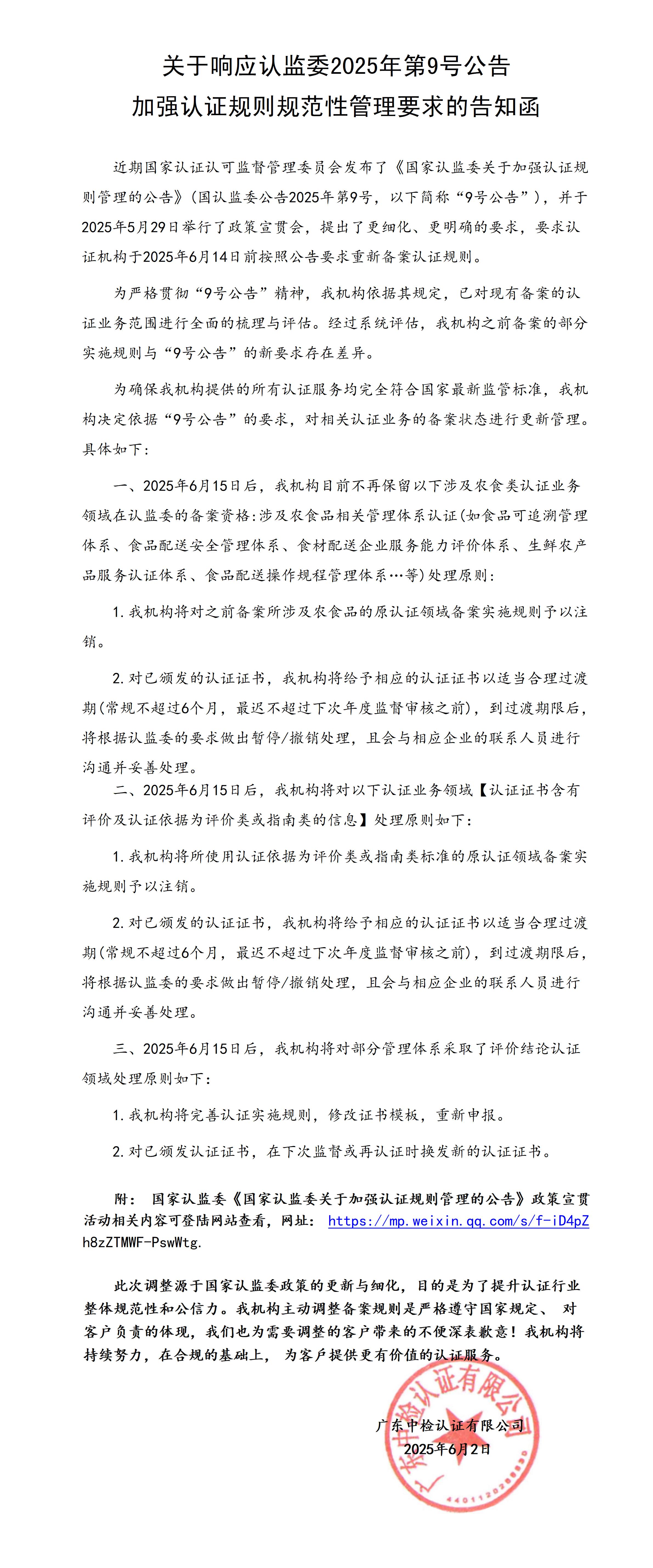 关于响应国家认监委2025年第9号公告加强认证规则规范性管理的告知函